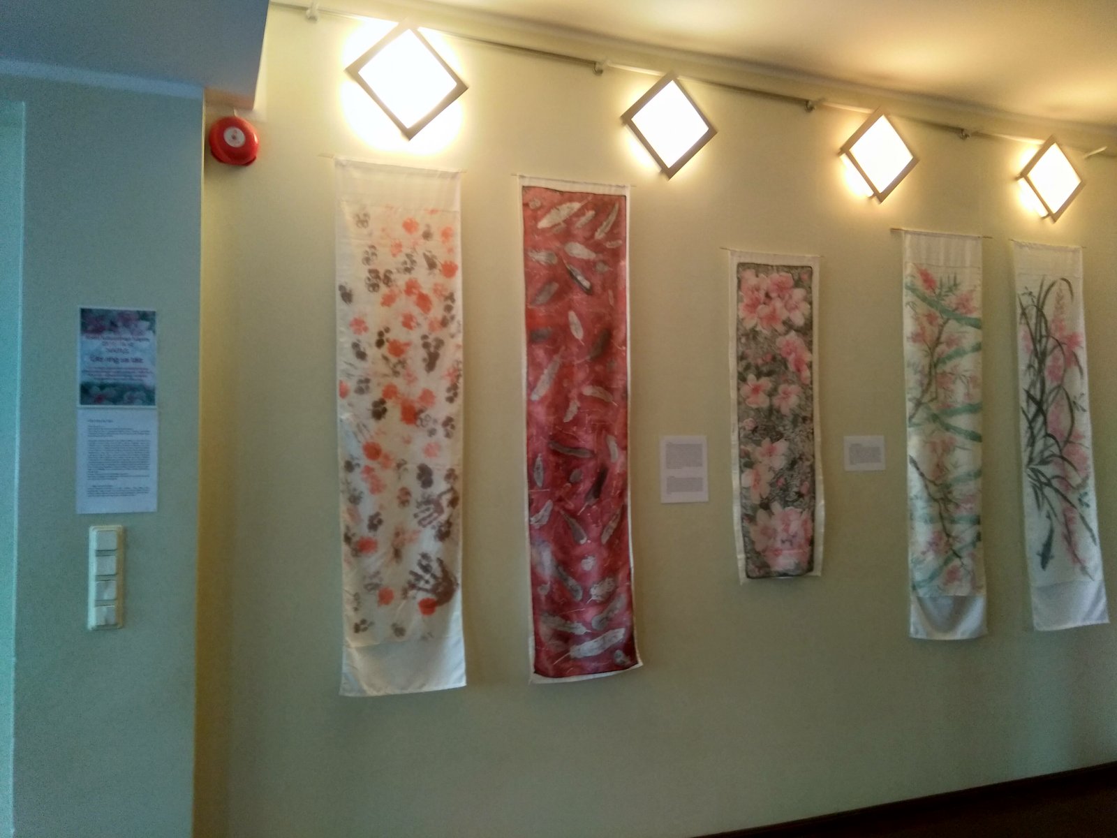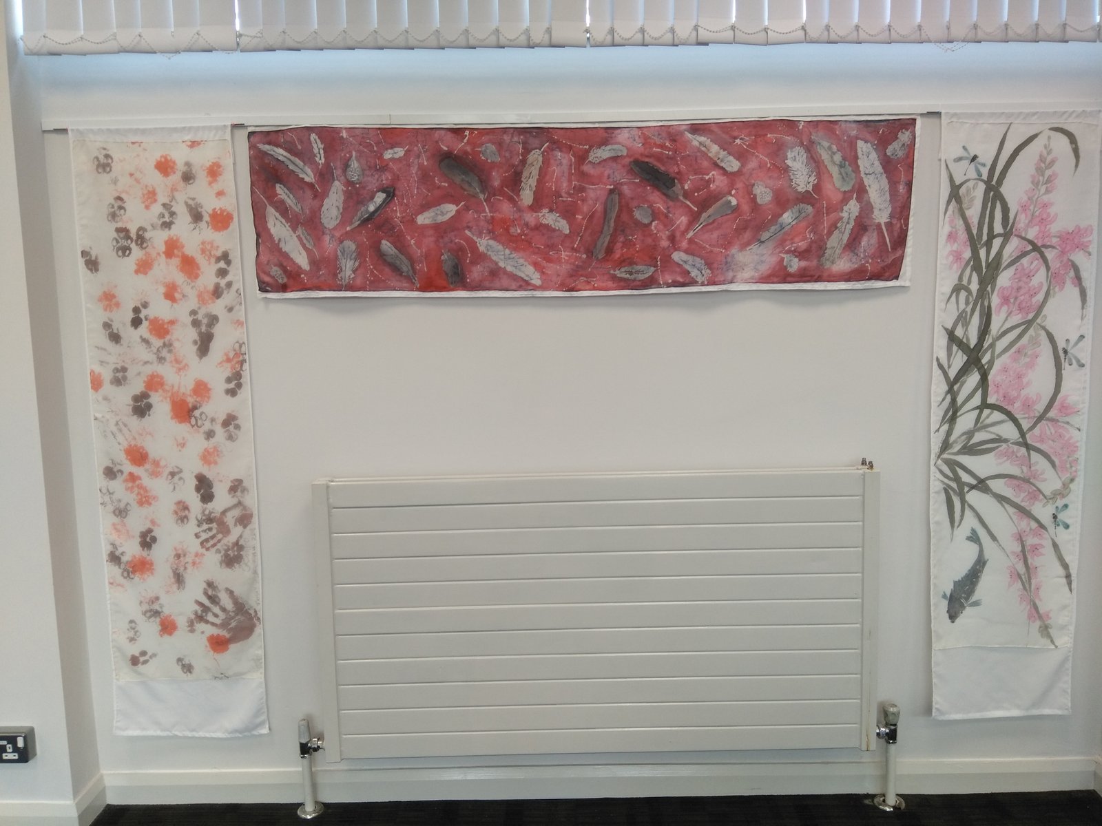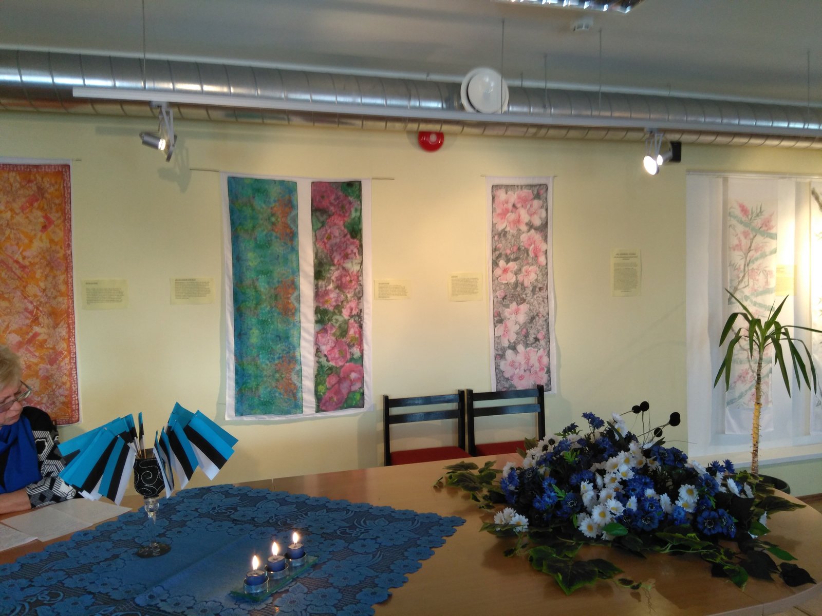 Oma tehniliselt kõige keerulisema töö riputasin alustuseks arvutilaua kohale. Kirsiõied sai loogilise koha tulederaami küljes ukse juures. Uksele sobis kutsuvalt pilku püüdma vilditud rätik. Rätikud sobisid tulede raamistiku külge heljuma. Nüüd on nad vaadeldavad mõlemalt poolt. Sallid sai grupeeritud esialgu pikkuse järgi ning paigutatud paremale seinale riiulite kohale. Ruum elavnes.