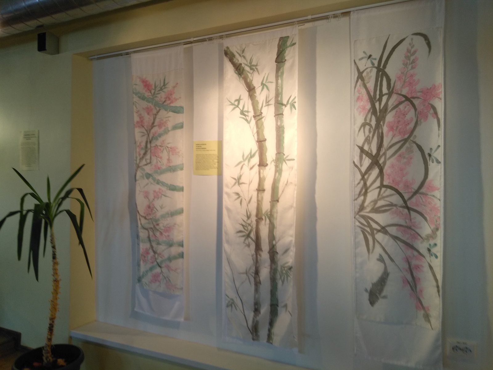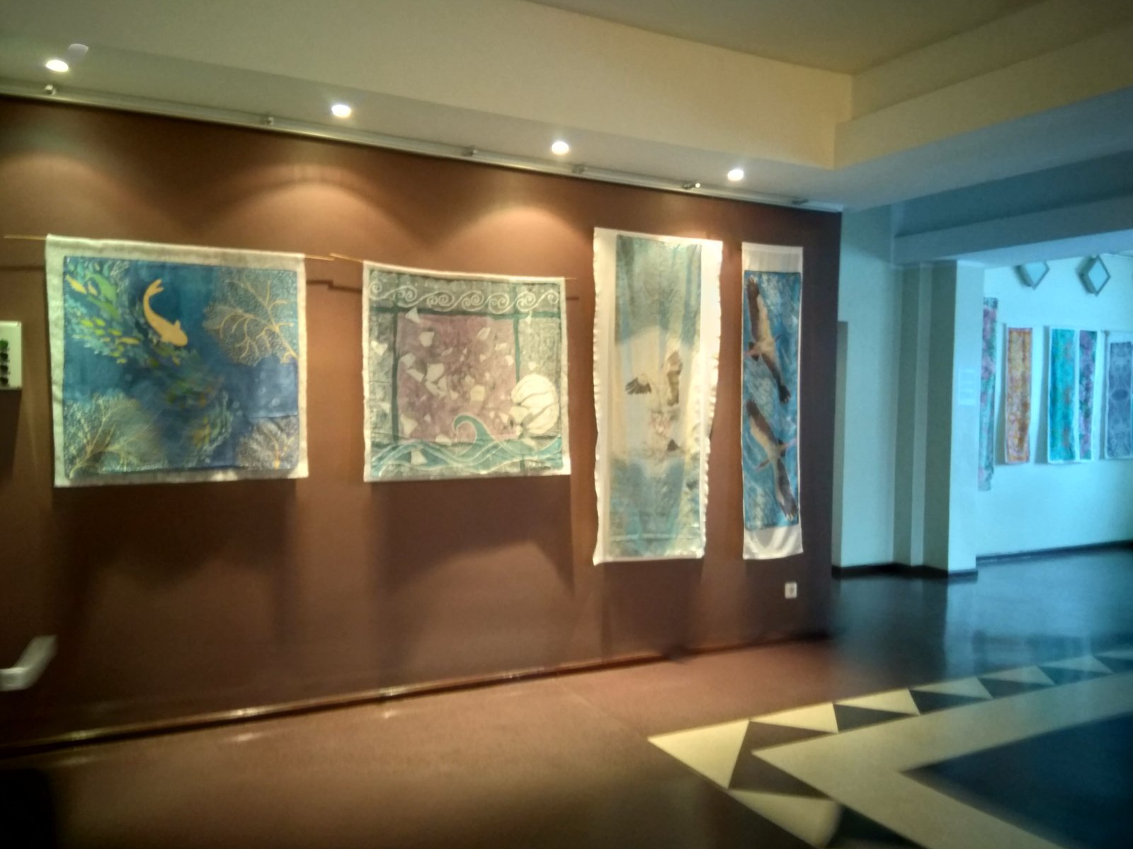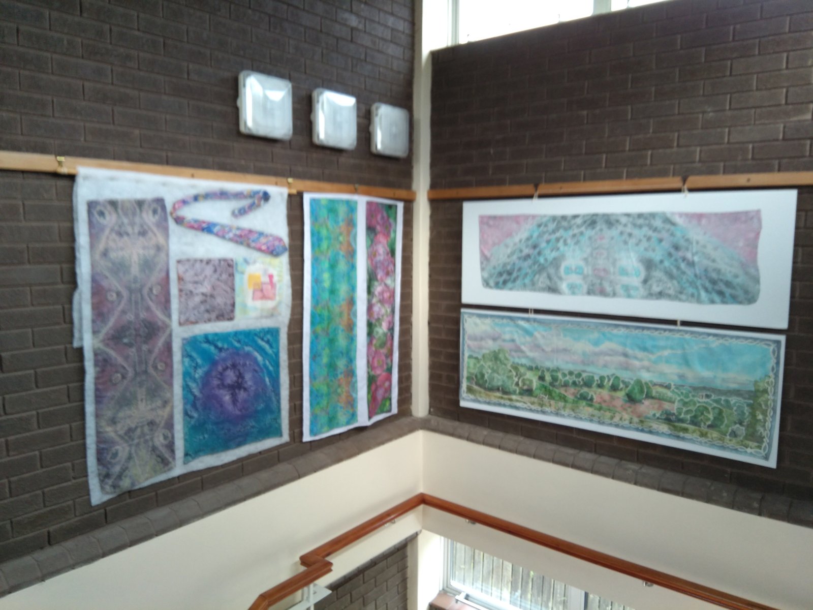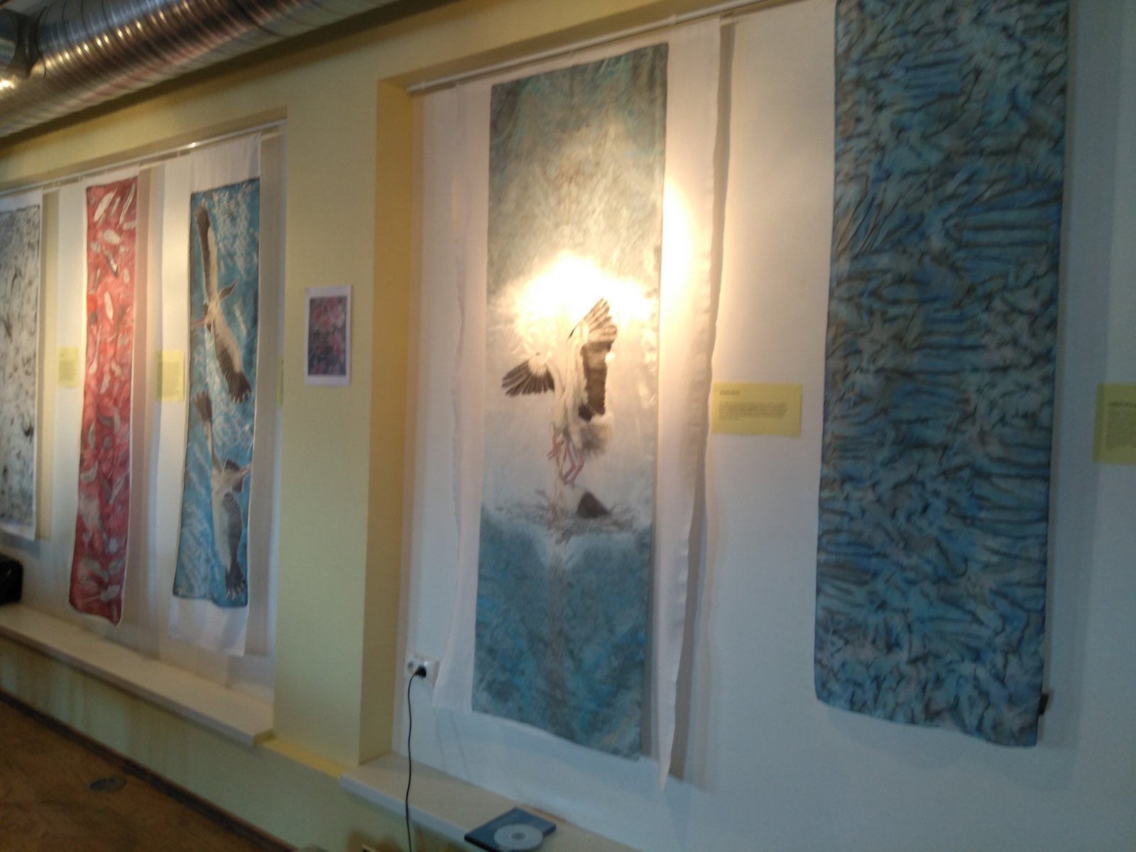 Selleks näituseks olin ma nunoviltinud oma kõige esimesed siidimaali tööd aastast 1998. Valge alusriidega sain ma neid 20 aastasest kasutamisest kulumismärkidega salle toetada, et neid eksponeerida. Kinnitusribaga näituse väljapanekut uuendades jäid need tööd välja, sest ei tundunud sobilik neid niimoodi kulunult näidata. Nunoviltimine osutus väga heaks võimaluseks anda neile siiditöödele nagu uus elu. Kõige esimese guttatehnikas heledates tonides rätiku viltisin loomuliku lambavalge villaga, millele lisasin mustris esinevat tooni kollast siidiniiti, et pisut elavdada nüüd rätiku pahupooleks jäävat ühtlast villast poolt.