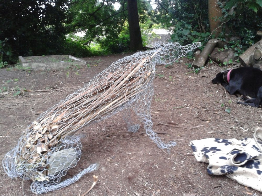 Viimati nimetatud töö omandas armas inimene, kes on Castle Wardis ülesse kasvanud ja endiselt selle paigaga tihedalt seotud. Castle Wardis elades, selle parkides ja aedades koeri jalutades, tekkis mul huvi katsetada aiaskulptuuri, mis toetaks kasulike putukate elu aias. Kuna ma olin just lähemalt kokku puutunud hurda koertega ja sellesse tõugu armunud ning modell istus kannatlikult mu kõrval, sündiski The Greyhound - hotel for Bugs (Hurt - putukate hotell). Traatvõrgust 3D kuju istudes valvsalt õhku nuusutavast hurdast. Kuju keha osa täitsin palmilehtedega, et putukatel oleks kuhu peitu pugeda. Näituse jaoks tegin Hurdale seltsiks kaks jänese kuju. Üks Jänes oli püstises valve asendis ja teine põgenemise hüppel. Näituse lõppedes koristati mu traatskulptuurid ära, nii et säilinud on vaid mõned fotod.